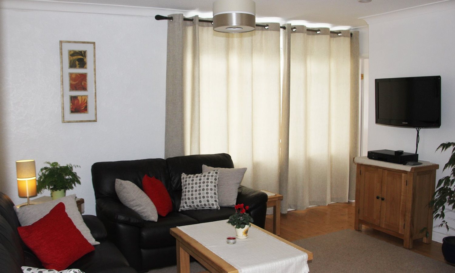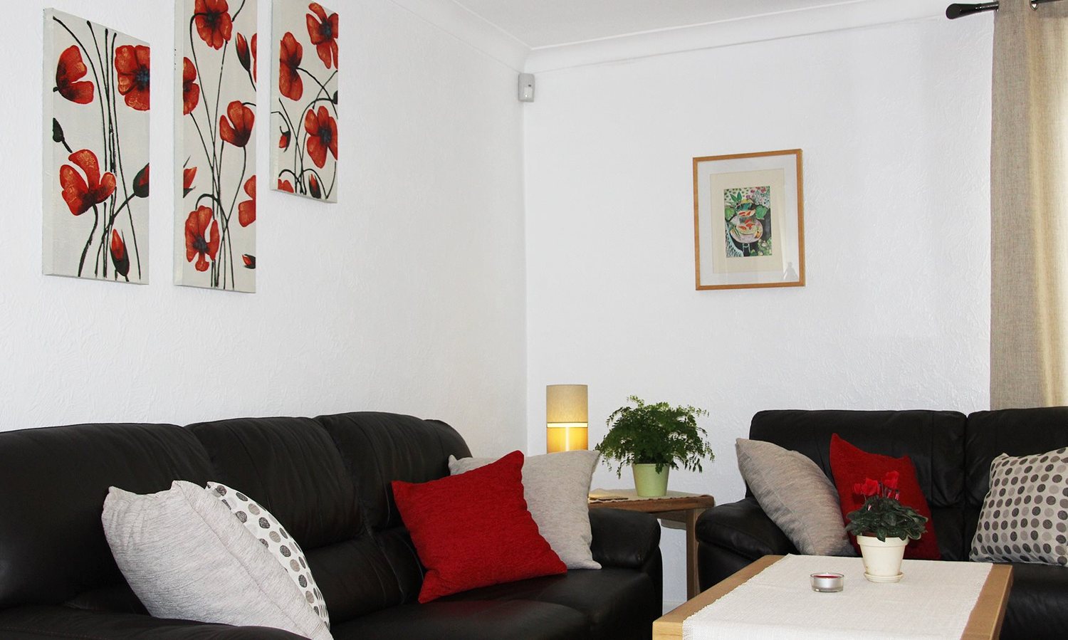 The comfortable Living room comprises of two leather sofas and a single chair, 32″ flat screen television with built in Freeview, a mini hi-fi unit (CD & Radio) gas fire and sideboard/cabinet.